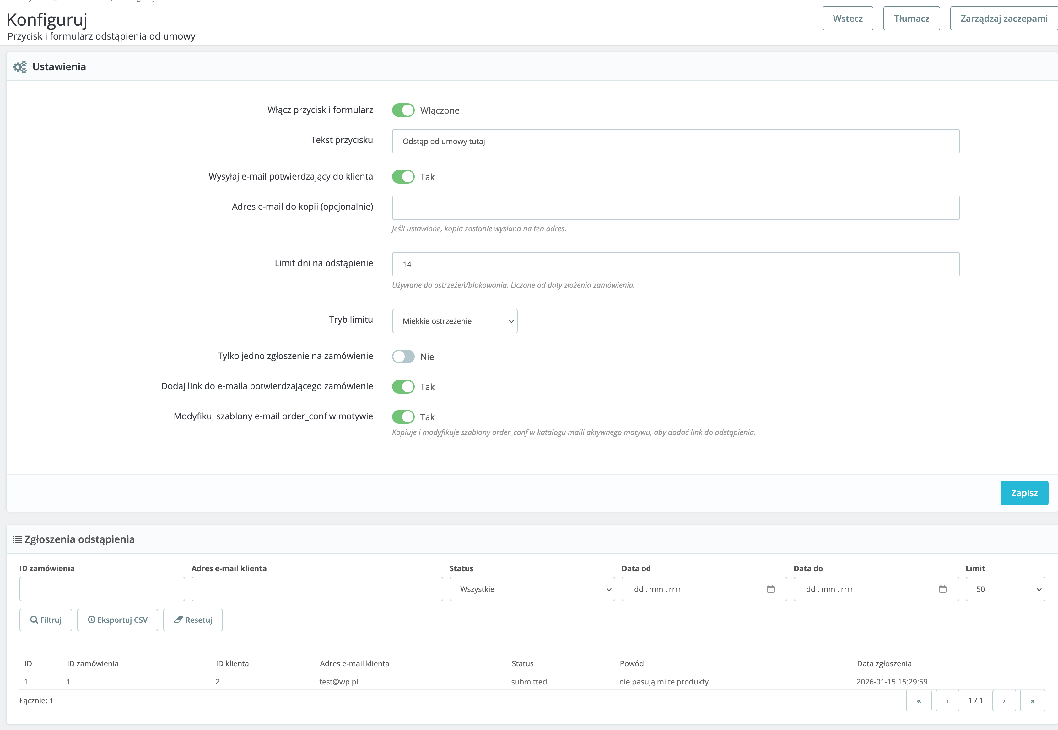 Moduł „Odstąp od umowy tutaj” został zaprojektowany jako kompletne, technicznie bezpieczne i przyszłościowe rozwiązanie dla sklepów internetowych opartych o PrestaShop. Jego celem jest spełnienie wymogów prawa konsumenckiego poprzez zapewnienie klientowi jasnego, jednoznacznego i łatwo dostępnego mechanizmu odstąpienia od umowy zawartej na odległość.